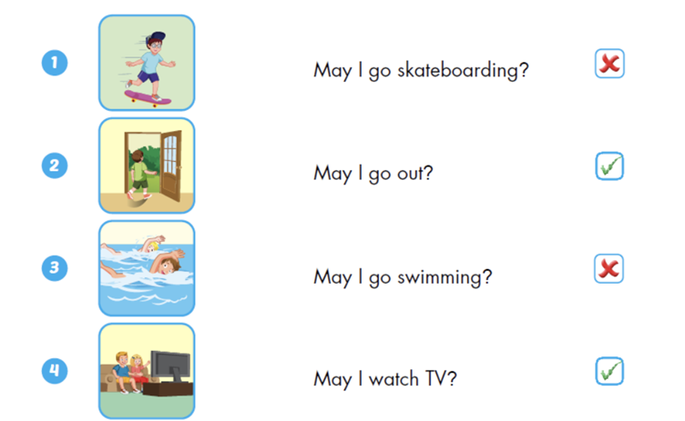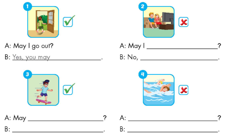 A: May I go skateboarding? (Tôi có thể trượt ván không?)