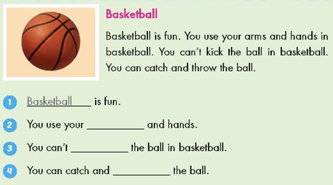 I am good at playing basketball. You use your arms and hands in basketball. You can catch and throw the ball in basketball. You can’t kick the ball.