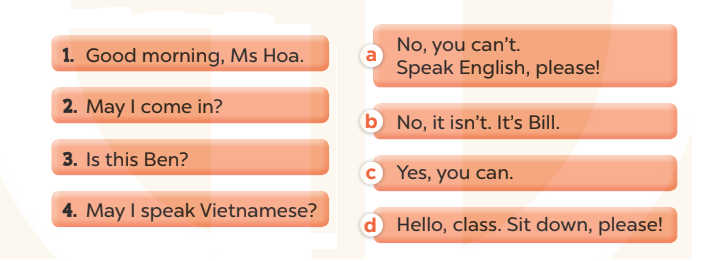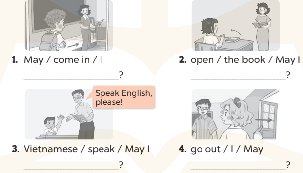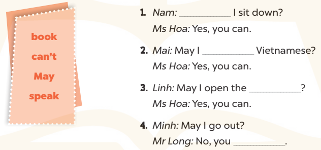 4. A: May I speak English? (Em có thể nói tiếng Anh được không?)
