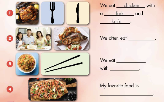 1. We eat chicken with a fork and knife. (Chúng tôi ăn gà bằng nĩa và dao.)