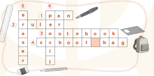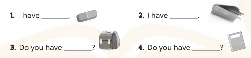 I have a _____, a ______, a ______, a _______, an ______ and an English book. Do you have any school things?