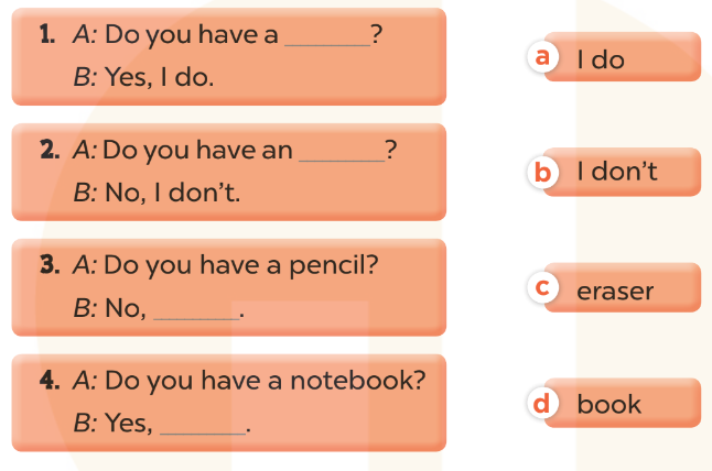 2. A: Do you have an eraser? (Bạn có một cục tẩy phải không?)