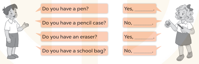 1. A: Do you have a pen? (Bạn có một chiếc bút máy phải không?)
