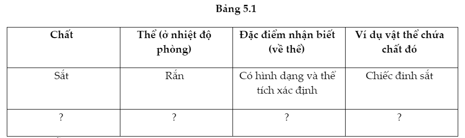 Tìm hiểu những chất quanh em để hoàn thành bảng theo gợi ý sau:Bảng 5.1
