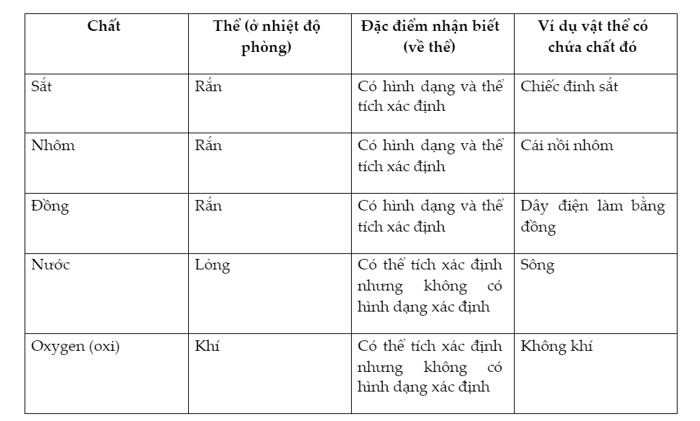 Chất Thể (ở nhiệt độ phòng) Đặc điểm nhận biết (về thể) Ví dụ vật thể chứa chất đó