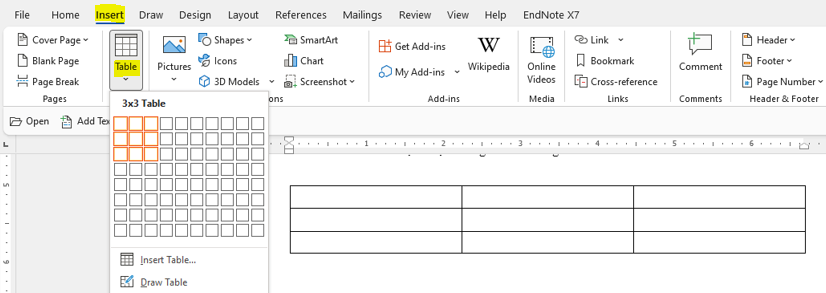 - Insert => Table => Chọn 3 cột 3 dòng.