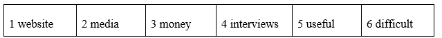 I've been working here at the station for two weeks now, and I think I'm beginning to understand what radio journalism is all about. Doing 1 ……………. in a real radio station is completely different from doing 2 …………. in Media Studies at college, that's for sure. The first thing they taught me was how to make everyone's coffee! But I've also learned a lot and enjoyed myself here. I've even met a lot of people from the 3 …………… business, like singers and actors. I'm doing a project while I train and I really hope I get good 4 ……….. for it. I finish studying this year and I'll need to get a 5 …………….. .Hopefully, the apprenticeship will go well and I'll be able to apply for 6 …………….. here!
