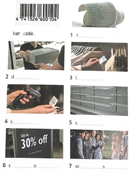 1. Complete the words. 2. Complete the notice with the words. 3. Elliot is shopping when he gets a phone call from his brother, David. Study the picture above and choose the correct words in 1-5. Then listen and check.
