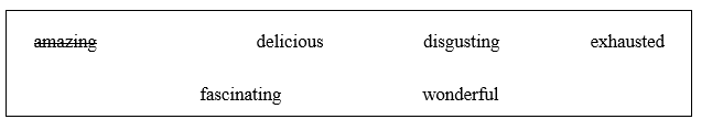 Today, I’ve been to an amazing food festival with my family. We’ve learned a lot of 1 fascinating things about food from different countries. We tried a tasty Jamaican dish called “Jerk chicken”. I thought it was absolutely 2 delicious! My younger sister didn’t agree. She thinks hots sauces are 3 disgusting! She looked sad until we found the Italian ice cream. How 4 wonderful! Now we’re home, I’m going to go to bed. I’m 5 exhausted after all that food!