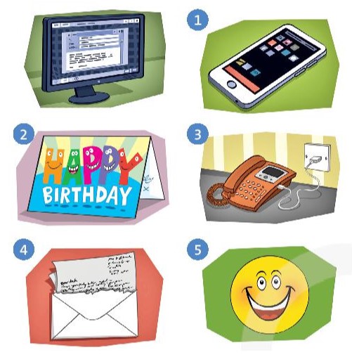 1.Look at the pictures.Correct the words.2.Complete the sentences with the words3.Complete the words in the text.4.How do you communicate with your friends and family in these situations? Write sentences using communication words and your own ideas.