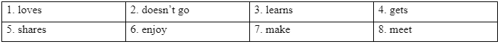 My cousin, Mi, (1. love) ______ cooking. She (2. not go) ______ to any cooking class. She (3. learn) ________ to cook from her mum, and sometimes she (4. get) ______ recipes from the Internet. She (5. share) ________ this hobby with her sister. I (6. enjoy) _______ cooking too, so Mi and I usually (7. make) _______ pizza together when we (8. meet) _______ at the weekend.