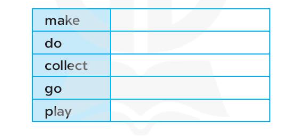 (Hoàn thành bảng với các từ ở bài 1. Một từ có thể đi với nhiều hơn một động từ. Sau đó, thêm MỘT từ nữa vào mỗi danh sách.)