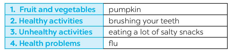 Example: clean water, shower gel, clean towel (Ví dụ: nước sạch, sữa tắm, khăn tắm sạch) 1. fried chicken and chips, chain restaurants, popular (gà rán và khoai tây chiên, chuỗi nhà hàng, bình dân) 2. bike, helmet, shoes, path (xe đạp, mũ bảo hiểm, giày dép, đường dẫn) 3. sweetened drinks with a lot of gas (đồ uống ngọt có nhiều gas) 4. black and white pimples on your body, especially on your face (nổi mụn đen và trắng trên cơ thể của bạn, đặc biệt là trên mặt của bạn) 5. dustpan, broom, water, floor cleaner (gạt bụi, chổi, nước, nước lau sàn) |