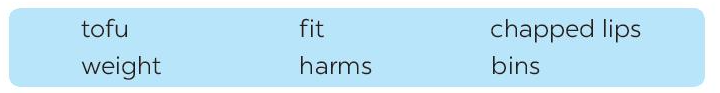 taking a bath (tắm) 1. fast food (thức ăn nhanh) 2. cycling (đi xe đạp) 3. soft drinks (nước ngọt) 4. acne (mụn) 5. house cleaning (dọn nhà) |