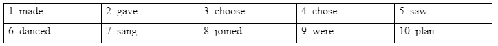 Last summer, our school started a community service project. Our teachers (1. make) ______a list of activities and (2. give) ______it to each class. We could (3. choose) ______the sctivities we wsnted to join. I (4. choose) ______ to help the elderly in the village nursing home. We (5. see) ______ them once a week, (6. dance) ______and (7. sing) ______for them. My friends (8. join) ______other activities like clean-up or gardening activities. We (9. be) ______very happy. We all (10. plan) ______to join other community activities this summer.