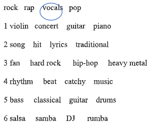 1 Giải thích: ‘concert’ là danh từ chỉ sự kiện, ba từ còn lại là danh từ chỉ nhạc cụ