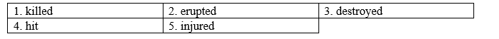 (Điền vào mỗi khoảng trống với các từ destroyed, killed, injured, erupted hoặc hit.)