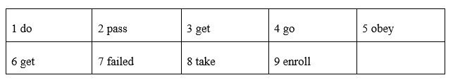 I've been at boarding school since I was eight. Living away from home is OK, but we have to 5 make / take / obey rules all the time. I don't always 6 pass / get / do good marks in tests, and last year, I 7 failed / fell / lost a math exam. This year, I need to 8 study / take / help extra classes and 9 enroll / join / sign myself in homework club to do better!