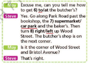 Steve: Vâng, đi dọc theo Park Road băng qua hiệu sách, bãi đậu xe hơi và cửa hàng bán bánh. Sau đó rẽ trái đến đường Wood. Tiệm bán thịt nằm ở góc đường kế bên.