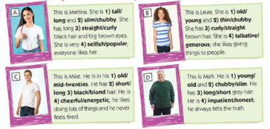 A. This is Martina. She is 1) tall/long and 2) slim/chubby. She has long 3) straight/curly black hair and big brown eyes. She is very 4) selfish/popular; everyone likes her.