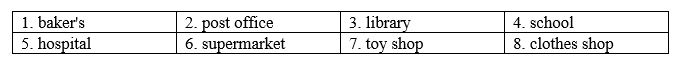 Wetherby is a small town in England. It is very beautiful. You can buy fresh bread and delicious cakes from the local 1) _______. Opposite the baker's, there is a 2) _______. You can send letters from there. There is also a 3) _______ in the town. You can borrow books from there. Next to it, there is a new 4) _______ with a computer in every classroom. Doctors work at the small 5) _______. There is also a big 6) _______ in the town. You can buy meat, fish, fruit and vegetables there. There isn't a mall in Wetherby, only small shops. For children, there is a 7) _______ with trains, cars, dolls and balls. There is also a 8) _______ with trendy clothes for everyone.