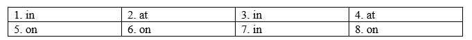 (Điền vào mỗi chỗ trống với in, on hoặc at.)