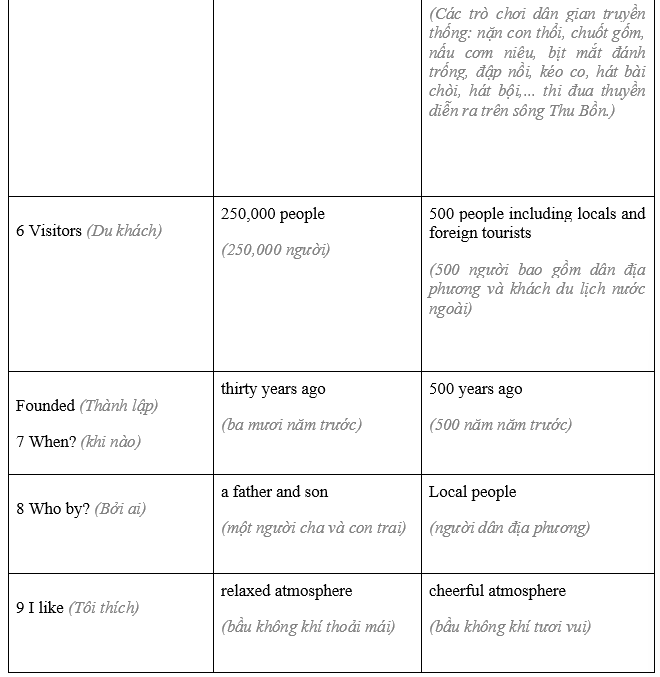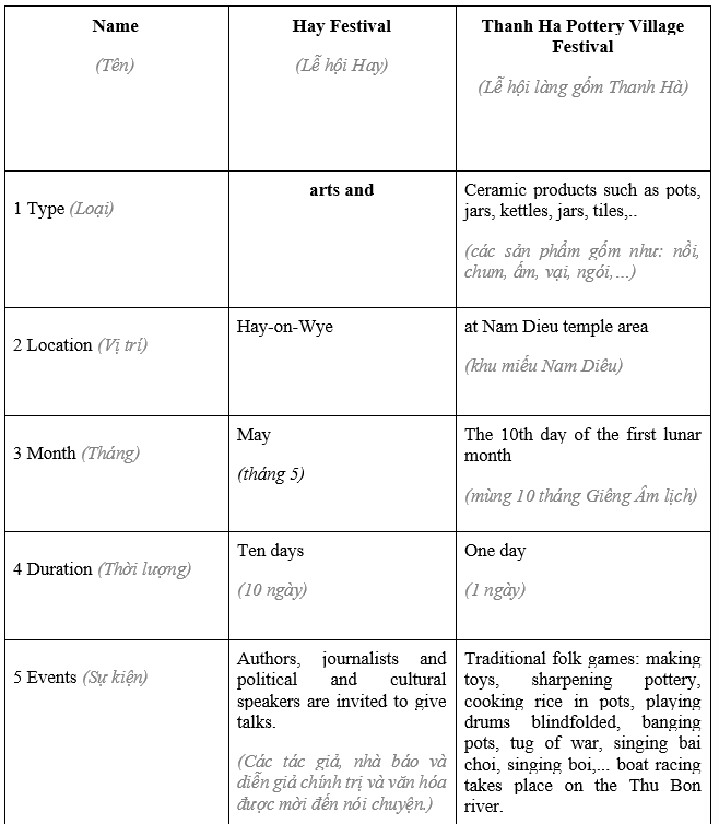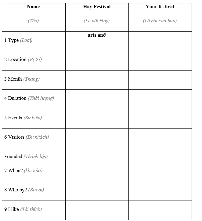 (Viết nhận xét của riêng bạn về một lễ hội. Hãy suy nghĩ và lập kế hoạch bằng cách hoàn thành bảng trong bài tập 2 với thông tin về lễ hội của bạn. Bao gồm các cụm từ trên trang này trong bài đánh giá của bạn.)