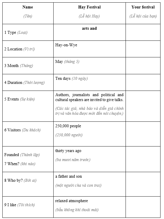 Tôi muốn nói về một lễ hội mà tôi đã tham dự gần đây. Nó được gọi là Lễ hội Hay và được tổ chức ở Hay-on-Wye trong mười ngày vào tháng 5 hàng năm. Hay là một thị trấn khác thường với gần ba mươi hiệu sách và lễ hội ở đây chủ yếu là về văn học và nghệ thuật. Các tác giả, nhà báo và diễn giả chính trị và văn hóa được mời đến nói chuyện. Trong lễ hội, thị trấn có 250.000 người đến thăm.