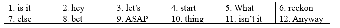 (Ngôn ngữ không chính thức/giao tiếp: OK, tuyệt, vì, Dù sao đi nữa.)