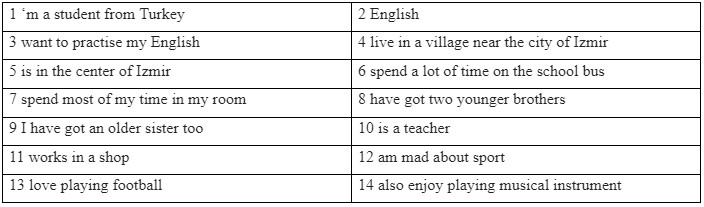 My family and I 4 live in a village near the city of Izmir. My school 5 is in the centre of Izmir and I 6 spend a lot of time on the school bus! In the evening, I 7 spend most of my time in my room doing homework or going online.