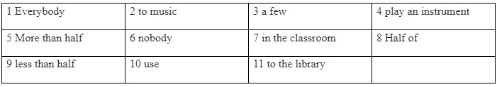 These are the results of our survey on what people do at lunchtime school. The results are from interview with ten students. 1 in our group listens 2 , but only 3 people 4 like the guitar. 5 of the group meet friends in the playground. However, 6 stays 7 . 8 the people post messages on social media, but 9 of the students 10 instant messaging now. Only two people go 11 , but more people probably like reading books when it isn’t lunchtime.